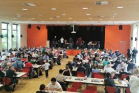 Der Turniertag näherte sich und die Anmeldeliste wurde länger und länger. Am Freitag Nachmittag (also etwas mehr als einen Tag vor dem Turnier) mussten wir dann schließlich die Reißleine ziehen: die Online-Anmeldung wurde gesperrt und eine Reserve-Liste eröffnet. Beim Aufbau am Samstag Nachmittag stellte sich dann glücklicherweise heraus, dass doch ein paar Tische und Stühle mehr vorhanden waren (insgesamt ausreichend für 200 Spieler), so dass man schnell noch allen Spielern auf der Reserve-Liste verbindlich zusagen konnte. Zusätzlich reisten noch einige Schachfreunde ‚auf Verdacht‘ (also ohne Voranmeldung) zu Turnierbeginn an, so dass schlussendlich 206 Spieler auf der Startrangliste standen. 17 der vor angemeldeten Spieler erschienen dann nicht (die meisten leider ohne vorherige Absage), wodurch dann aber auch die ‚auf Verdacht‘ angereisten noch mitmachen konnten.